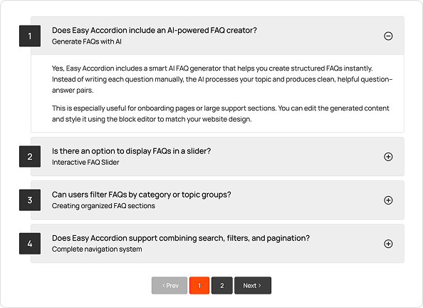 No coding knowledge is required. Easy Accordion is designed to be beginner-friendly, allowing you to create and customize FAQs and accordions through an intuitive visual interface.