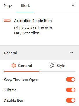 The Accordion Single Item is the core building block of your accordion. Selecting an individual item allows you to customize its specific behavior, content structure, and style independently from the rest of the accordions for your selected accordion block.