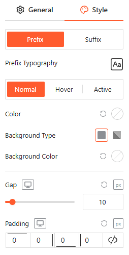 From this panel, you can customize the typography, color, background, and spacing for your prefixes and suffixes to ensure they perfectly match your brand.