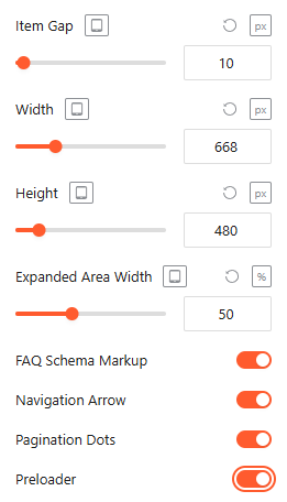 - Expanded Area Width: Define how much space (in percentage) an item occupies when it is active or expanded.