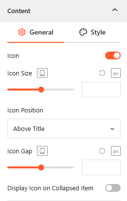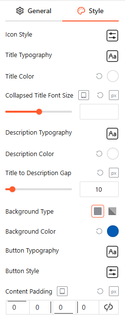From the Content Style panel, you can customize Icon Style, Title, and Description Typography and Color, Collapsed Title Font Size, Title to Description Gap, Button Typography and Style, and Content Padding.