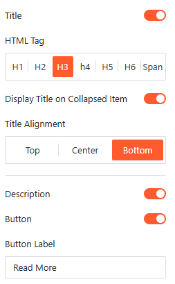 - Title Visibility: Choose whether to Display Title on Collapsed Item to keep headings visible even when the panel is closed.