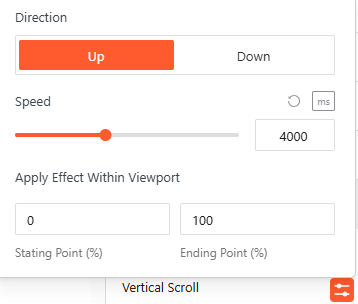 - Vertical Scroll: Define the animation Direction (Up/Down) and Speed, and apply the effect within specific viewport ranges.