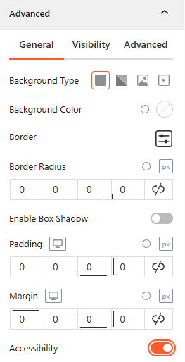 The Advanced panel allows you to manage the overall container of the accordion, covering visibility, accessibility, and high-level styling.