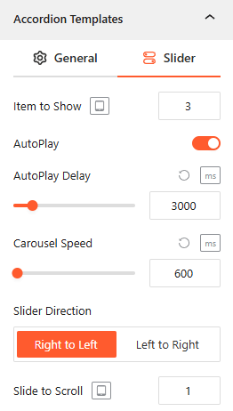 - Slider Settings: Configure items to show, autoplay, slide speed, direction, and slides per scroll.