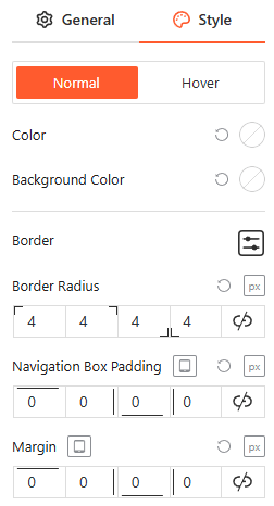 From the style panel, you can fully customize the navigation arrows for both Normal and Hover states by adjusting the icon color, background color, border settings, border-radius, navigation box padding, and external margin.