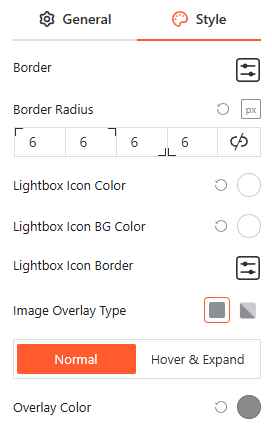 From this image style panel, you can easily customize the Image Typography, Border Radius, Overlay Colors, and Icon Backgrounds for both Normal and Hover states.