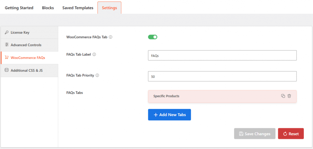 - WooCommerce FAQs Tab: Toggle this switch to enable or disable the custom FAQ tab on your product pages.