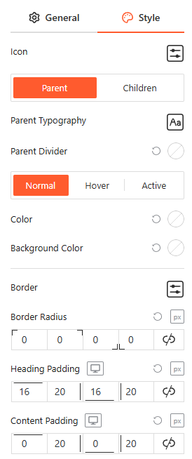 From this panel, you can customize the Typography, Colors, and Background Colors for both child and parent category items in various interaction states, while also adjusting Borders, Border Radius, and Padding to ensure brand consistency.