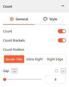 - Count: Toggle this on to display the total number of items (posts or products) within each category.