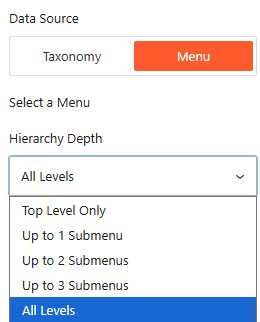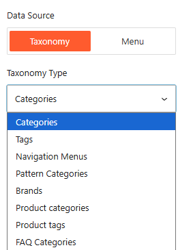 - Data Source: Toggle between Taxonomy (for categories, tags, brands) or Menu (for existing WordPress navigation menus).