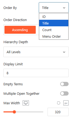 - Order By: Sort your items by ID, Title, Count (number of posts), or Menu Order.