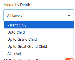 - Hierarchy Depth: Control how many levels of sub-items are shown for Menu (e.g., Top Level Only, Up to 2 Submenus, or All Levels) and Category (e.g., Parent Only, Up to Child, Up to Grand Child, Up to Great-Grand Child, or All Levels)