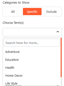 - Filter Mode: Choose to show all items, select Specific terms to include, or exclude certain categories from the list.