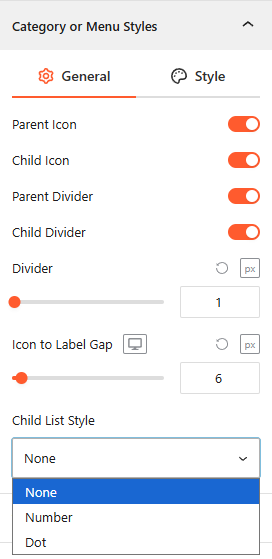 - Child List Style: Choose a list indicator for sub-items, such as None, Number, or Dot.