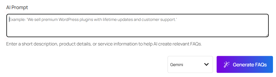Generate high-quality, relevant FAQs in seconds using the powerful AI FAQ Generator. By integrating with Google Gemini, it automates FAQ creation so you don’t have to manually write every question and answer. Simply provide keywords, content sources, or custom prompts, and the system instantly generates accurate, structured FAQs — saving time and making your content creation effortless.