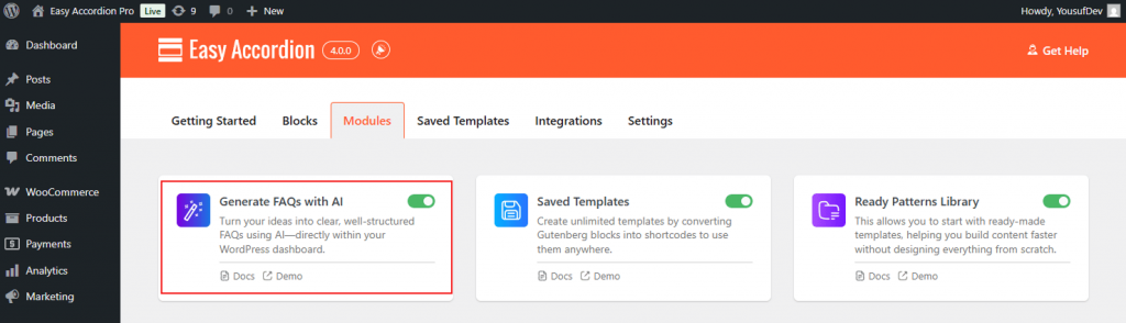 - Find the Generate FAQs with AI Module, then toggle it to ON.
