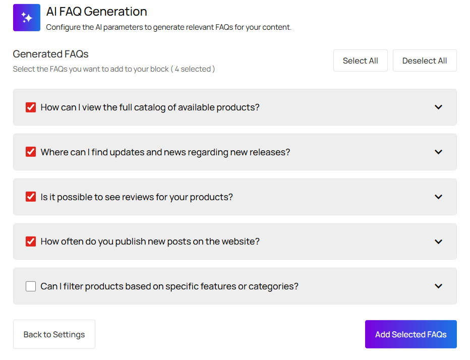- Filter, Insert & Delete FAQs: After generating the FAQs, you can easily filter, select, insert the necessary FAQs, and even delete irrelevant FAQs as you wish.