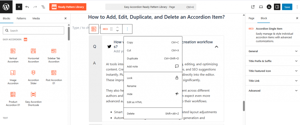 - Add: Click the (+ Add New FAQ) button at the bottom of the block or the plus icon in the toolbar.