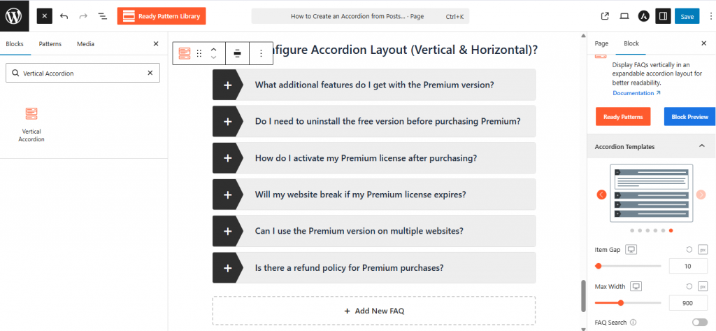 - Click the (+) Block Inserter icon in the editor or type /accordion to find the block.