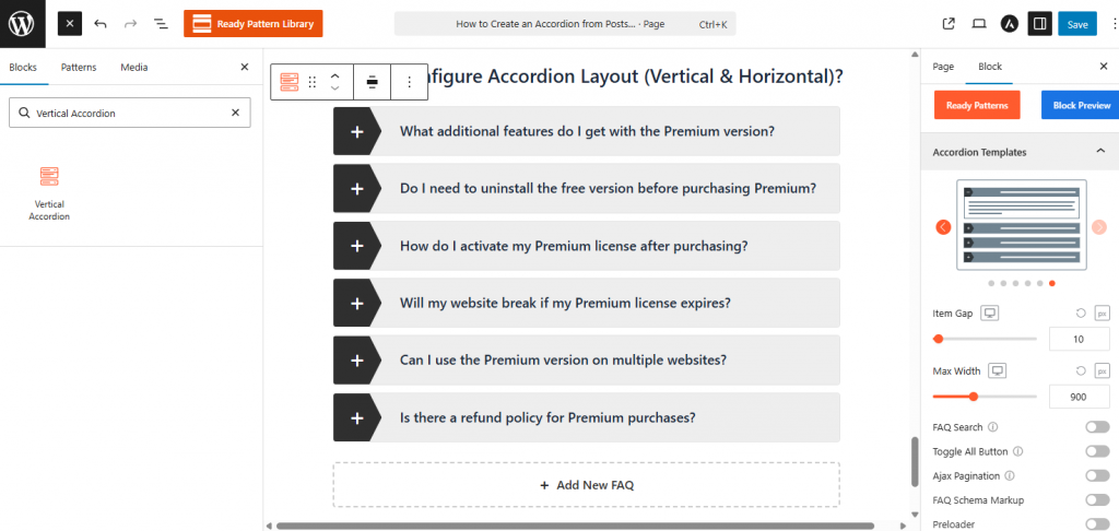 - Click the orange Ready Pattern Library button at the top of the block editor.