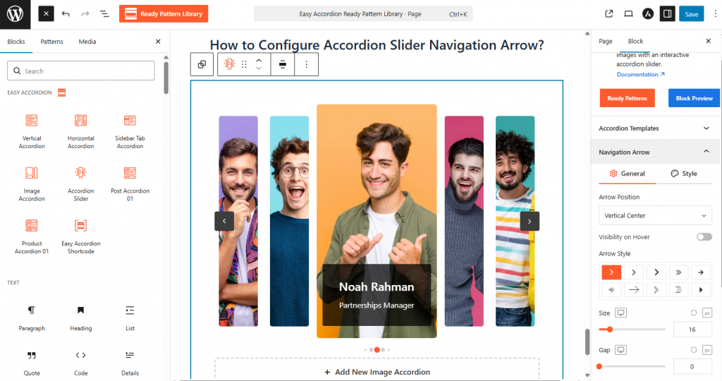 - Select the Accordion Slider block and go to the Navigation Arrow panel in the sidebar settings.