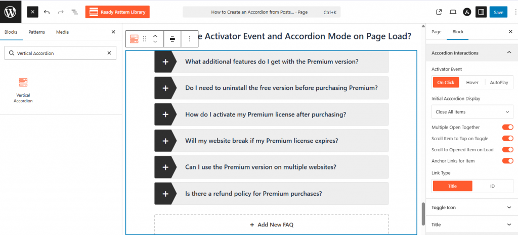 - Choose the Mode on Page Load (e.g., Open First Item, Open All Items, Close All Items) to define the initial display state.