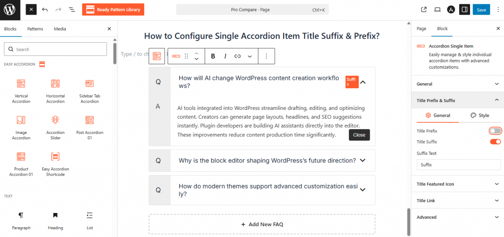 - Use the Title Prefix & Suffix section to add leading or trailing text/icons to your header.