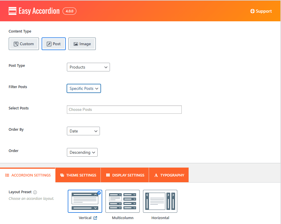 Choose the Post content source and set the Post Type to Products to begin pulling your WooCommerce data dynamically into the accordion items.