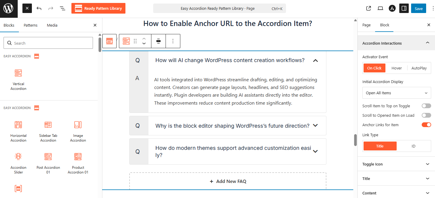 - Choose the Mode on Page Load (e.g., Open First Item, Open All Items, Close All Items) to define the initial display state.