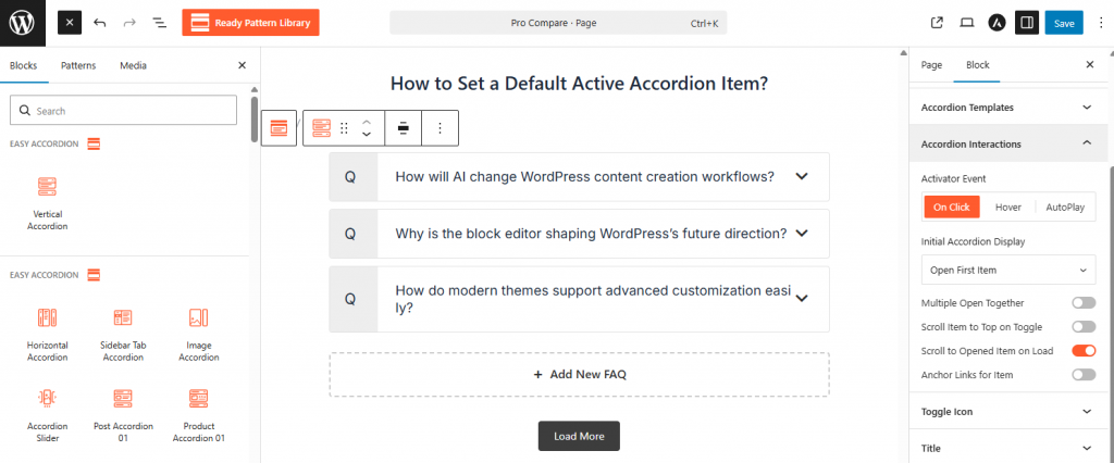 - Choose the Mode on Page Load (e.g., Open First Item, Open All Items, Close All Items) to define the initial display state.