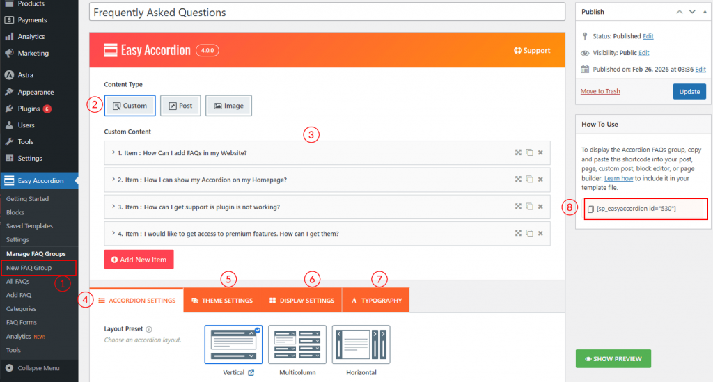 - Go to Easy Accordion → Manage FAQ Groups → Click Add New FAQ →And enter a Section Title (optional) for your accordion group.
