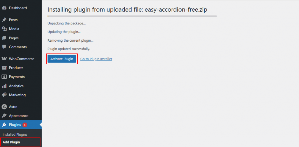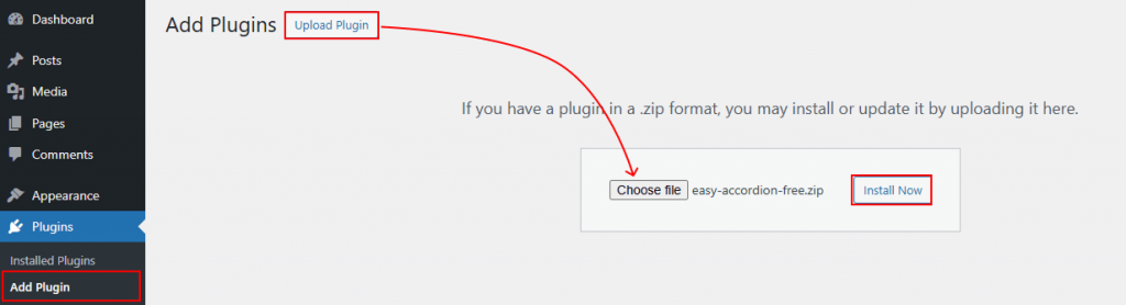 - Click Choose File, select easy-accordion-pro.zip, and click Install Now.