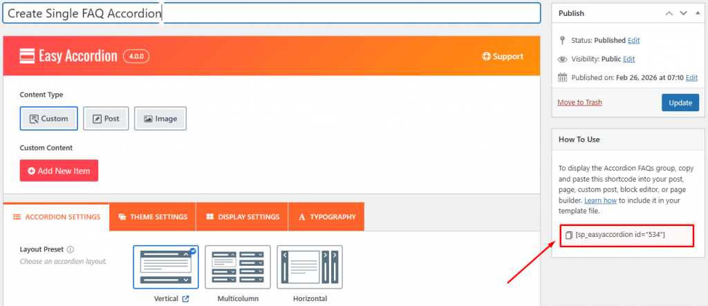 3. Create Your First FAQ Accordion Showcase Using Classic Shortcodes: