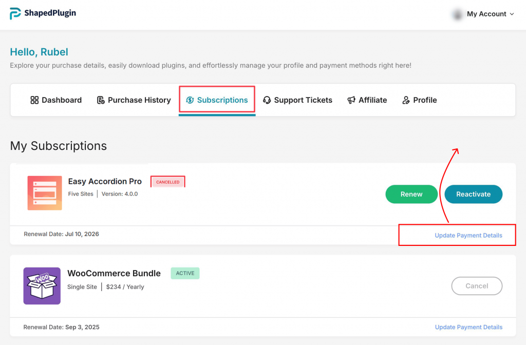 After purchasing the Easy Accordion plugin, you can easily update or change your Credit/Debit Card information by following these steps: