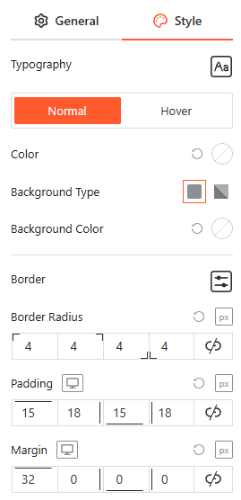 From this panel, you can fully customize the button’s visual identity by defining the Typography, Colors, and Background Type for both Normal and hover states, while adjusting the Border, Radius, Padding, and Margin for a high-impact design.
