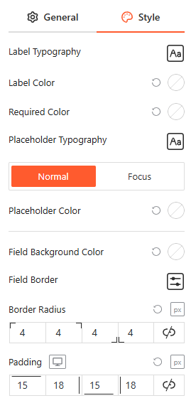 From this panel, you can fully customize the visual appearance of your form fields by defining Label & Placeholder Typography, Colors, and Field Backgrounds, while adjusting Border Radius and Padding for a modern, user-friendly interface.