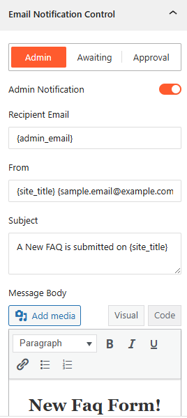 • Admin Notification: Enable this toggle to send an automatic email alert to the site administrator whenever a new FAQ is submitted.
