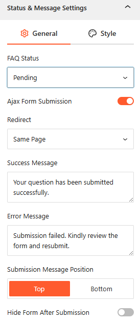 • Success & Error Messages: Customize the exact text for both the Success Message (e.g., “Your question has been submitted successfully.”) and the Error Message (e.g., “Submission failed. Kindly review…”).