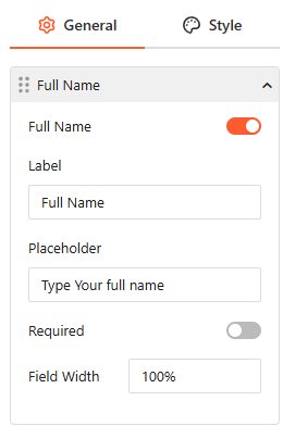 • Field Customization: For each field, you can set a custom Label, a descriptive Placeholder, and define the Field Width (e.g., 100%).