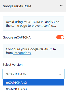 • Version Selection: Choose between reCAPTCHA v2 or reCAPTCHA v3 based on your security preferences.