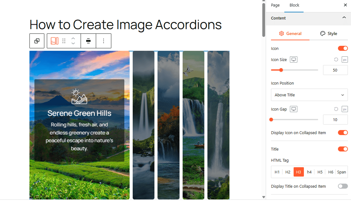 After enabling this block, it’s time to create an image accordion.